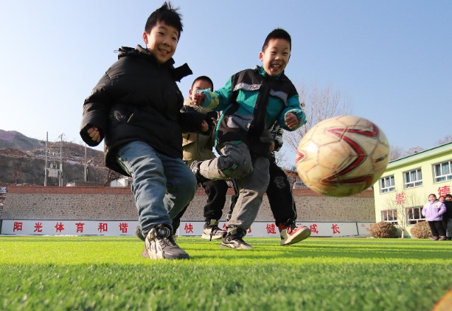 1月16日,淶水縣三坡學(xué)區(qū)紫石口小學(xué)操場上同學(xué)們在踢足球。去年夏天被洪水沖毀的操場和圍墻已修繕一新。中國教育報-中國教育新聞網(wǎng)記者 張學(xué)軍 攝
