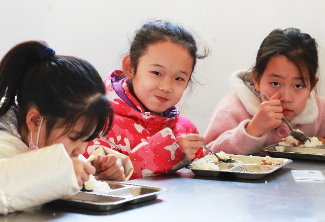 1月16日,淶水縣三坡學(xué)區(qū)愛心小學(xué)食堂,馬各莊小學(xué)異地就讀的學(xué)生在吃午飯。
