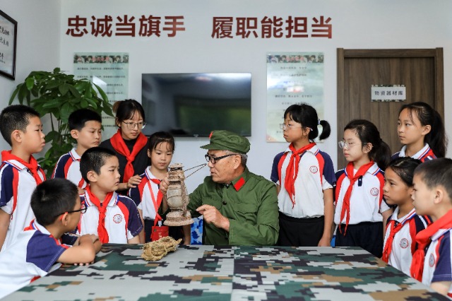 近日,浙江省湖州市長興縣呂山小學(xué)在呂山村老兵驛站聆聽退役老兵講紅色故事。周洪峰 攝