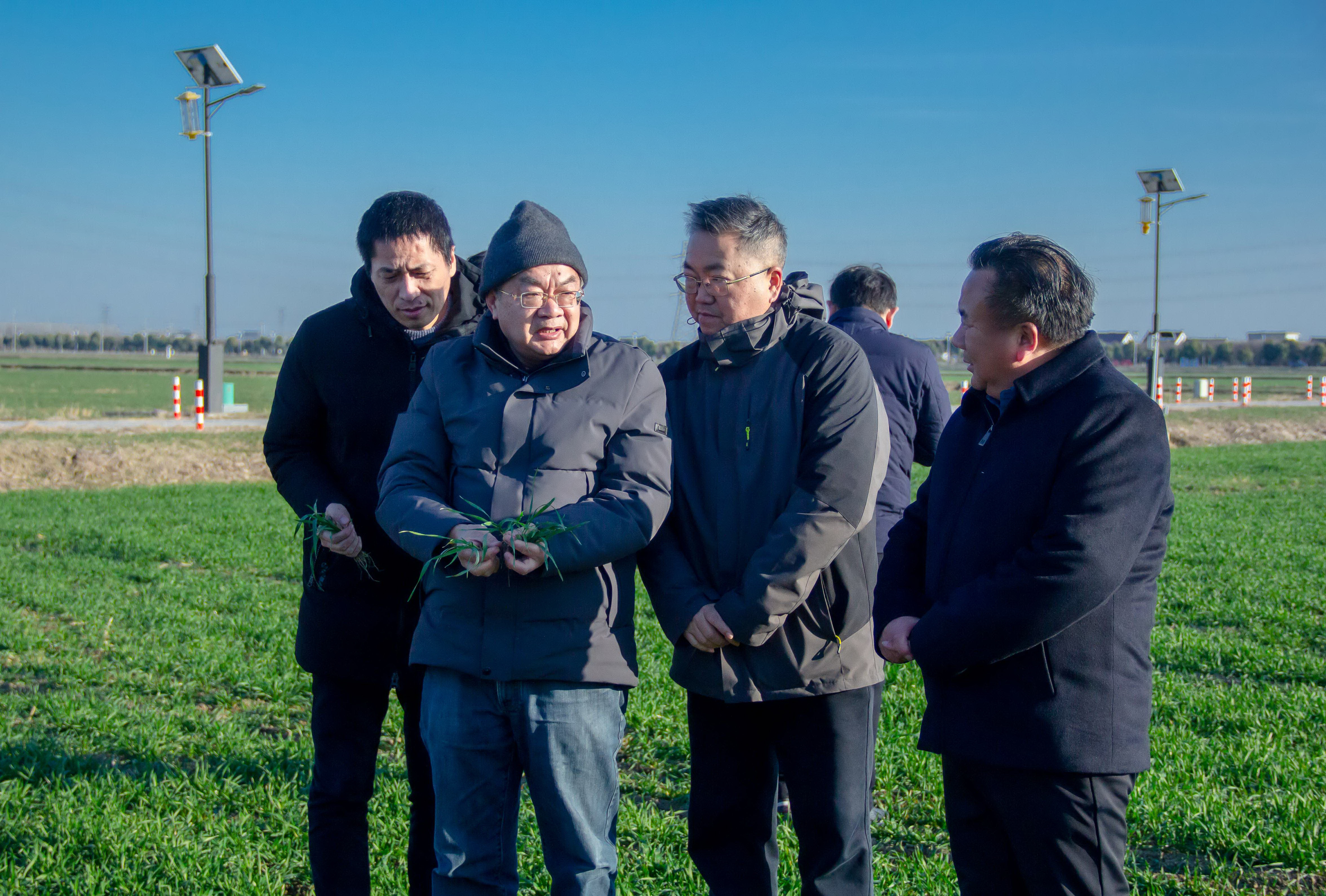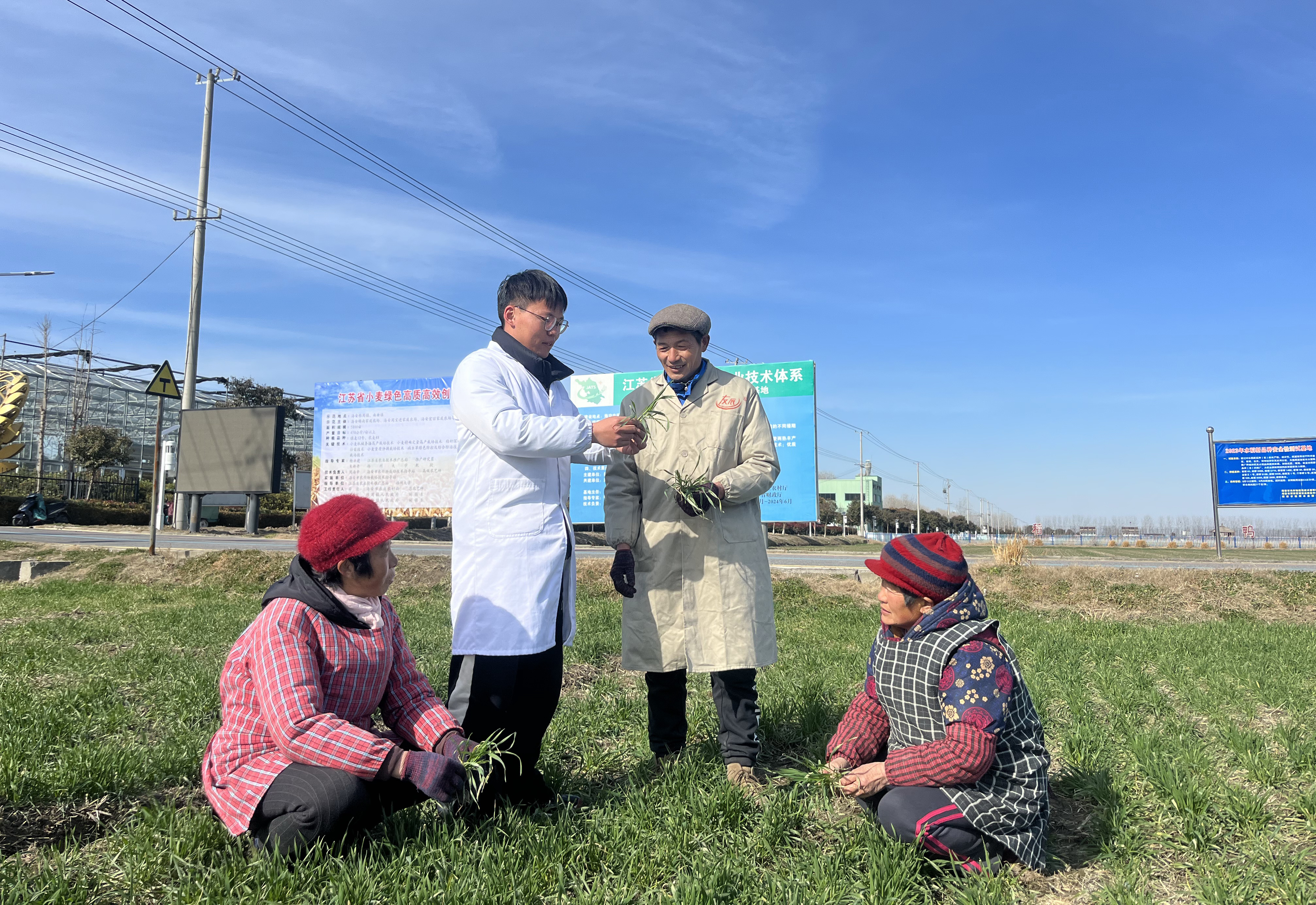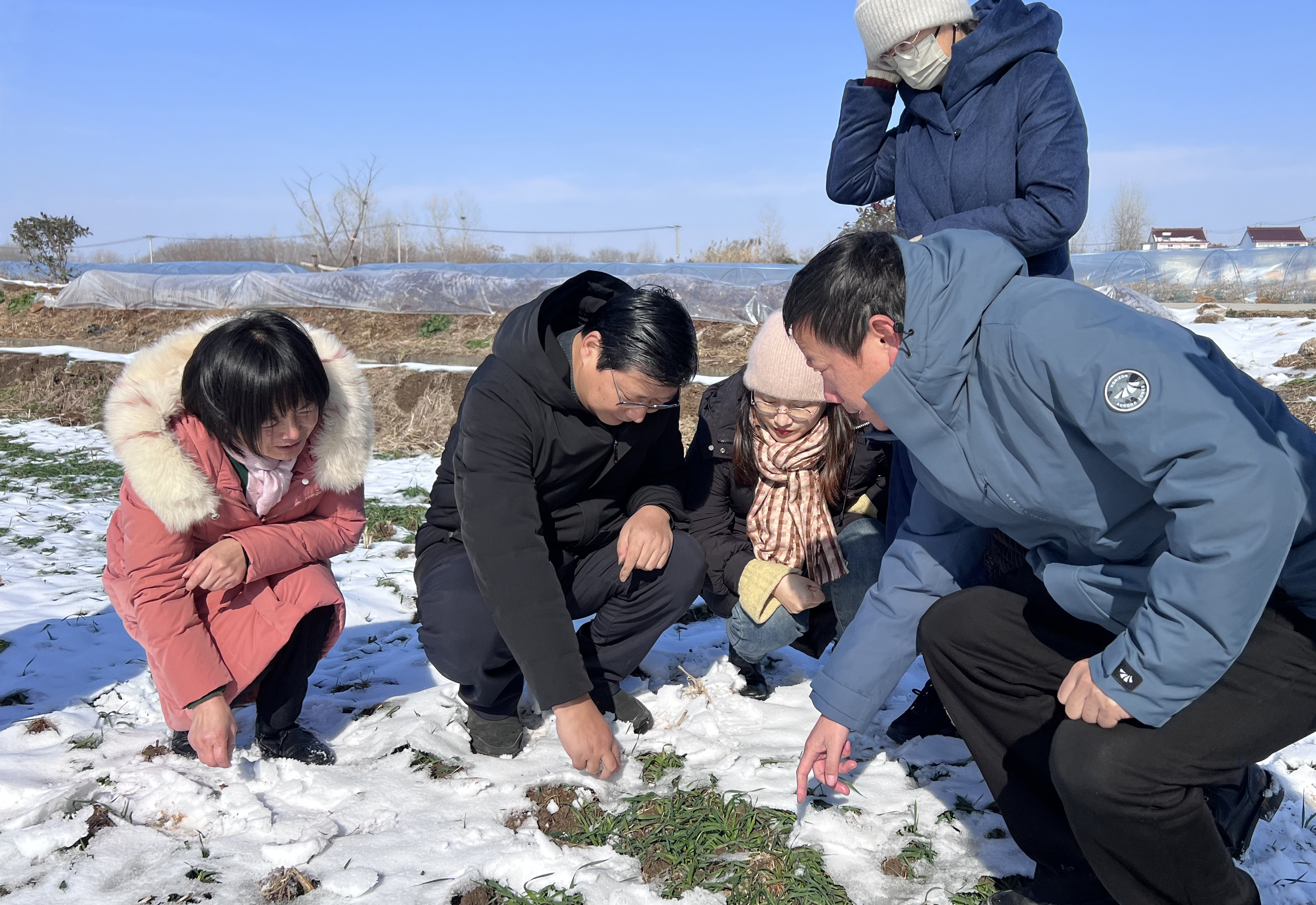 日前,朱新開(左二)帶領(lǐng)師生到儀征市小麥綠色高質(zhì)高效創(chuàng)建示范方開展小麥雨雪冰凍災(zāi)害防范指導服務(wù)。