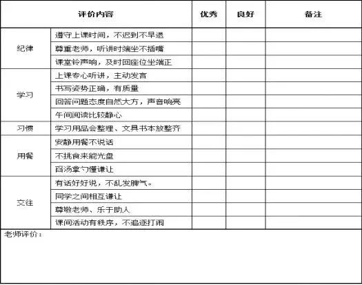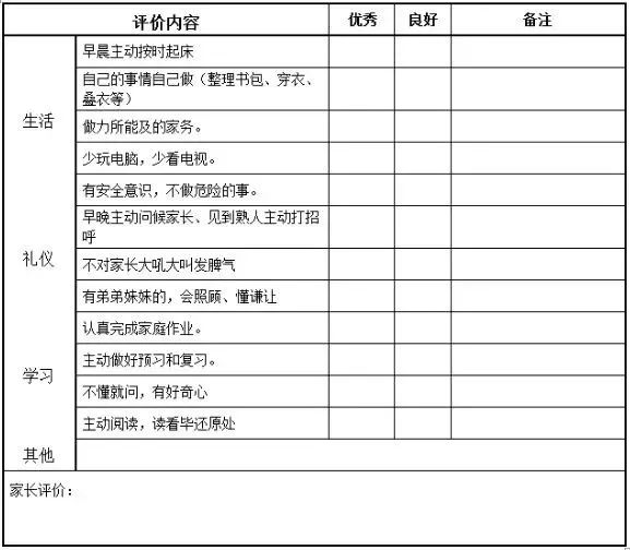 家校互動的方式有很多種,推薦一種表格的形式,以幫助家長督促孩子良好習慣的養(yǎng)成,另一方面也給教師一個了解學生動態(tài)的渠道。