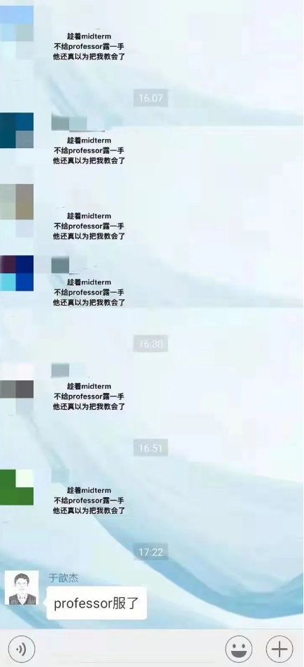 每次新學(xué)期伊始,于歆杰都會(huì)一個(gè)一個(gè)加上選課同學(xué)的微信,再一個(gè)一個(gè)把他們拉進(jìn)課程群。很多其他課上助教做的事,他事事躬親卻覺(jué)得稀松平常。一百多人的大群,同學(xué)們插科打諢,他偶爾也會(huì)語(yǔ)出驚人。