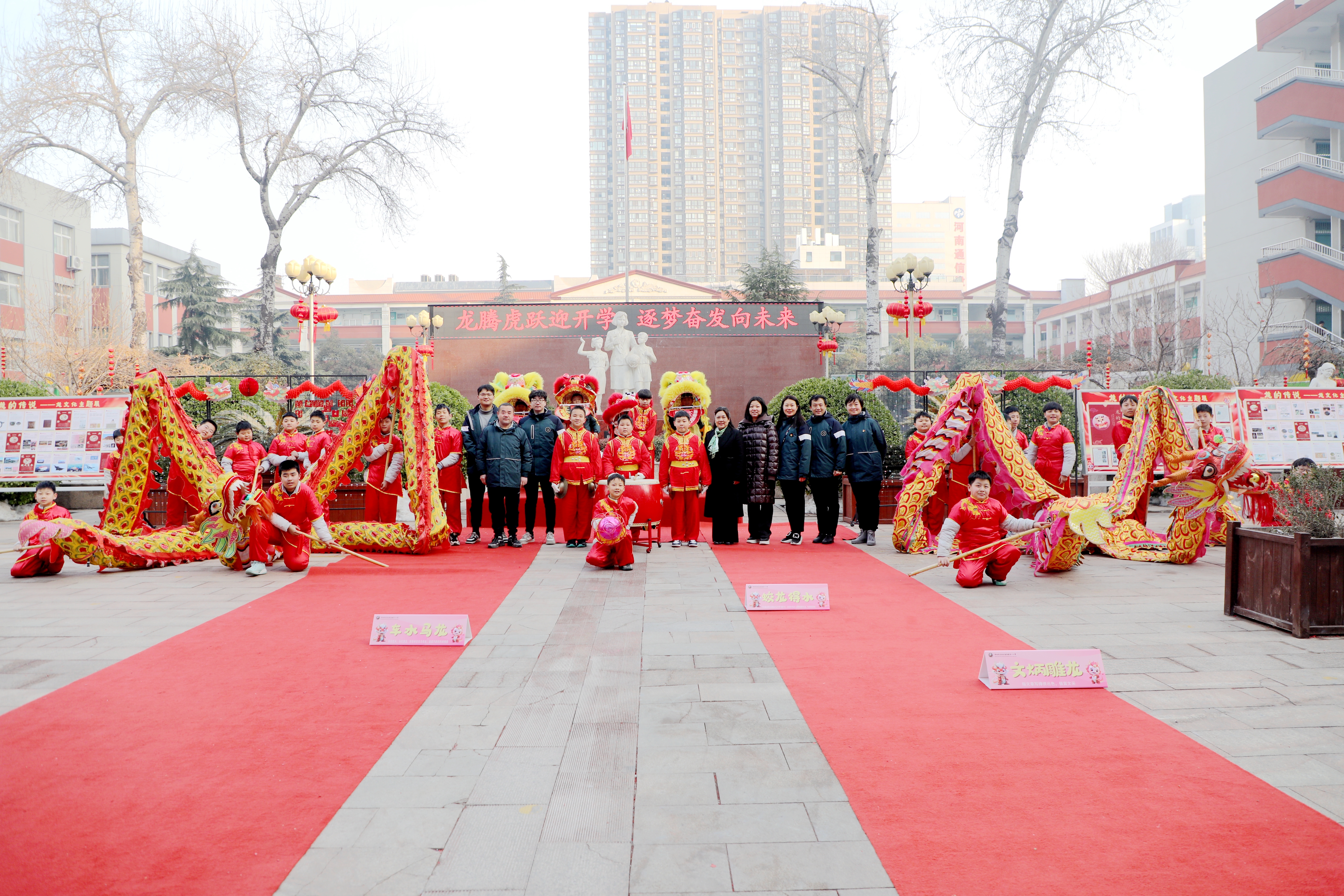 學(xué)生通道旁有關(guān)龍知識(shí)的展板依次排開(kāi),學(xué)生們所到之處都洋溢著新學(xué)期的喜慶氣氛,展板上的龍言龍語(yǔ),也寓意著孩子們?cè)谛聦W(xué)期中能夠勇攀高峰,自我超越,實(shí)現(xiàn)自我價(jià)值。