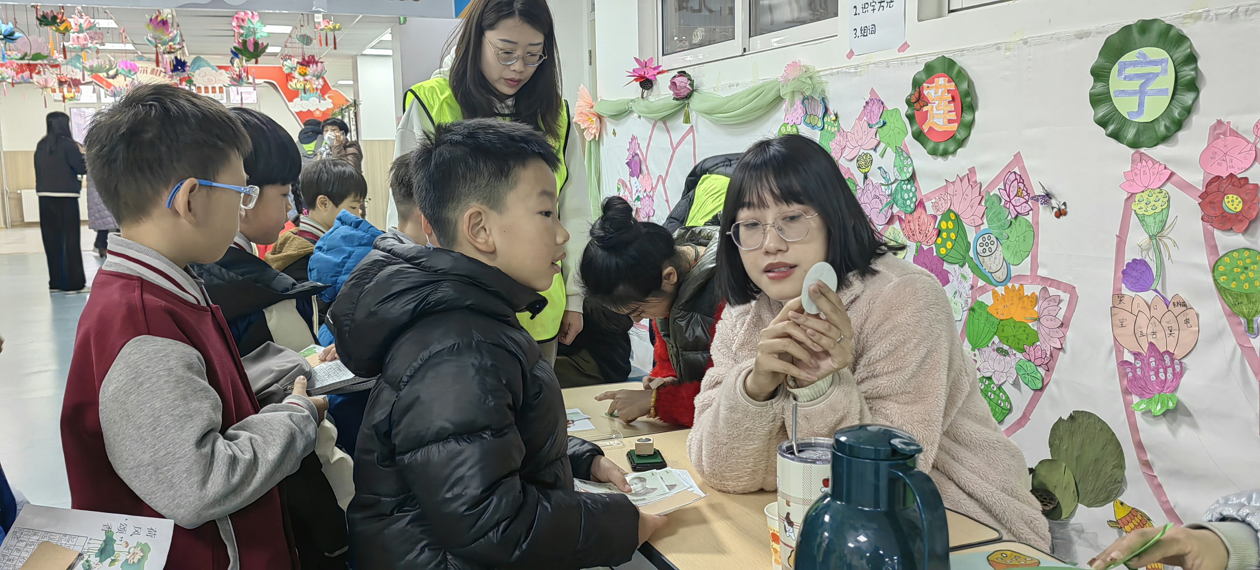 濟(jì)南高新區(qū)金谷小學(xué)一年級(jí)學(xué)生參與和“蓮”有關(guān)的繩子卡片制作識(shí)字等闖關(guān)活動(dòng)。魏海政攝