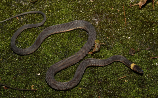 2022年10月14日,莫小陽團(tuán)隊(duì)成員李輝、朱樂強(qiáng)等在懷化市通道縣進(jìn)行生物多樣性資源調(diào)查,突然,一條被汽車壓扁的蛇吸引了他們的注意力?!八臀覀円酝吹降募股哂行┎灰粯?,頸部有乳黃色的環(huán)紋?!睂σ吧鷦游锓浅釔鄣睦钶x敏銳地意識到“這條蛇不簡單”。隊(duì)員們將它帶回了實(shí)驗(yàn)室,經(jīng)過形態(tài)學(xué)分析以及分子檢測,發(fā)現(xiàn)該種與已知的脊蛇屬其他物種均有差異。