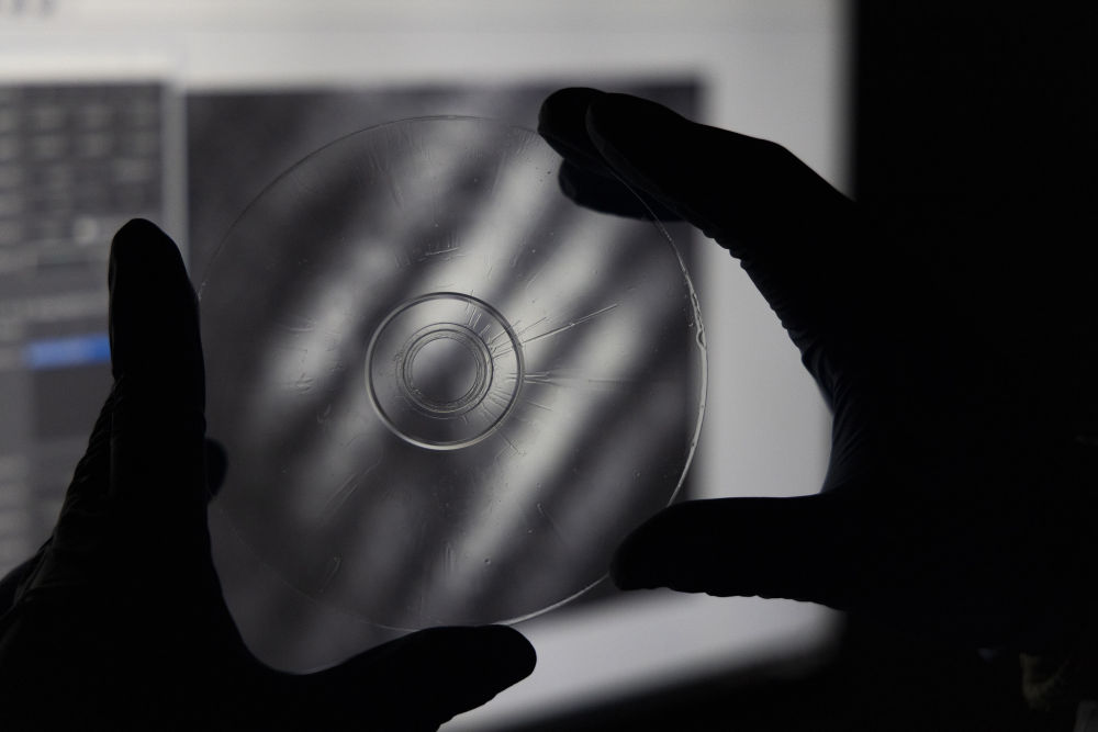 2024年2月29日在上海光機所光學實驗室拍攝的“超級光盤”。2月21日,中國科學院上海光學精密機械研究所對外宣布存儲容量是普通光盤上萬倍、普通硬盤上百倍的“超級光盤”誕生。據計算,十幾張“超級光盤”就可以存儲下整個國家圖書館的數據量。