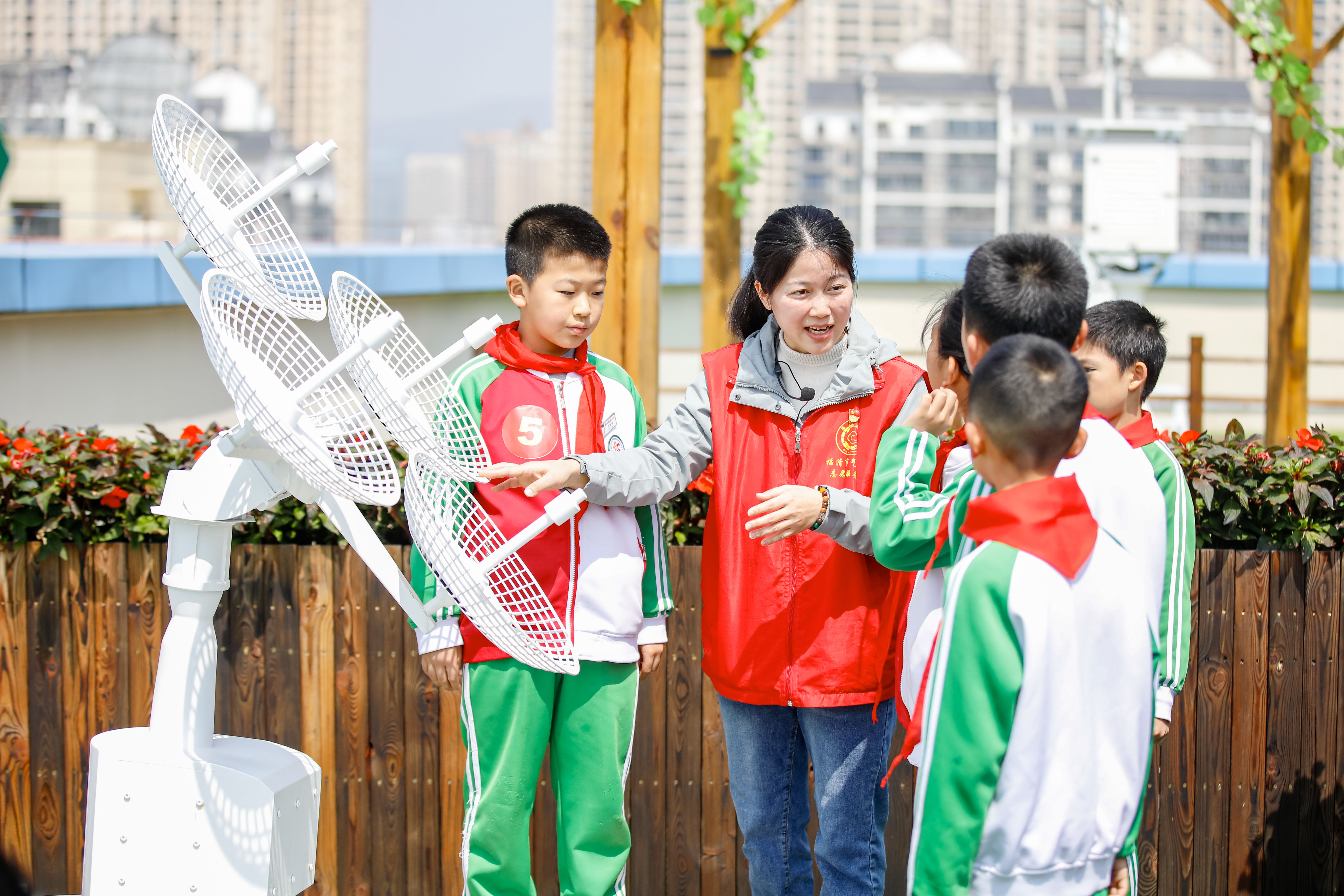 氣象工作志愿者正在給孩子們講解探空雷達(dá)的有關(guān)氣象知識(shí)。通訊員 謝貴明 攝