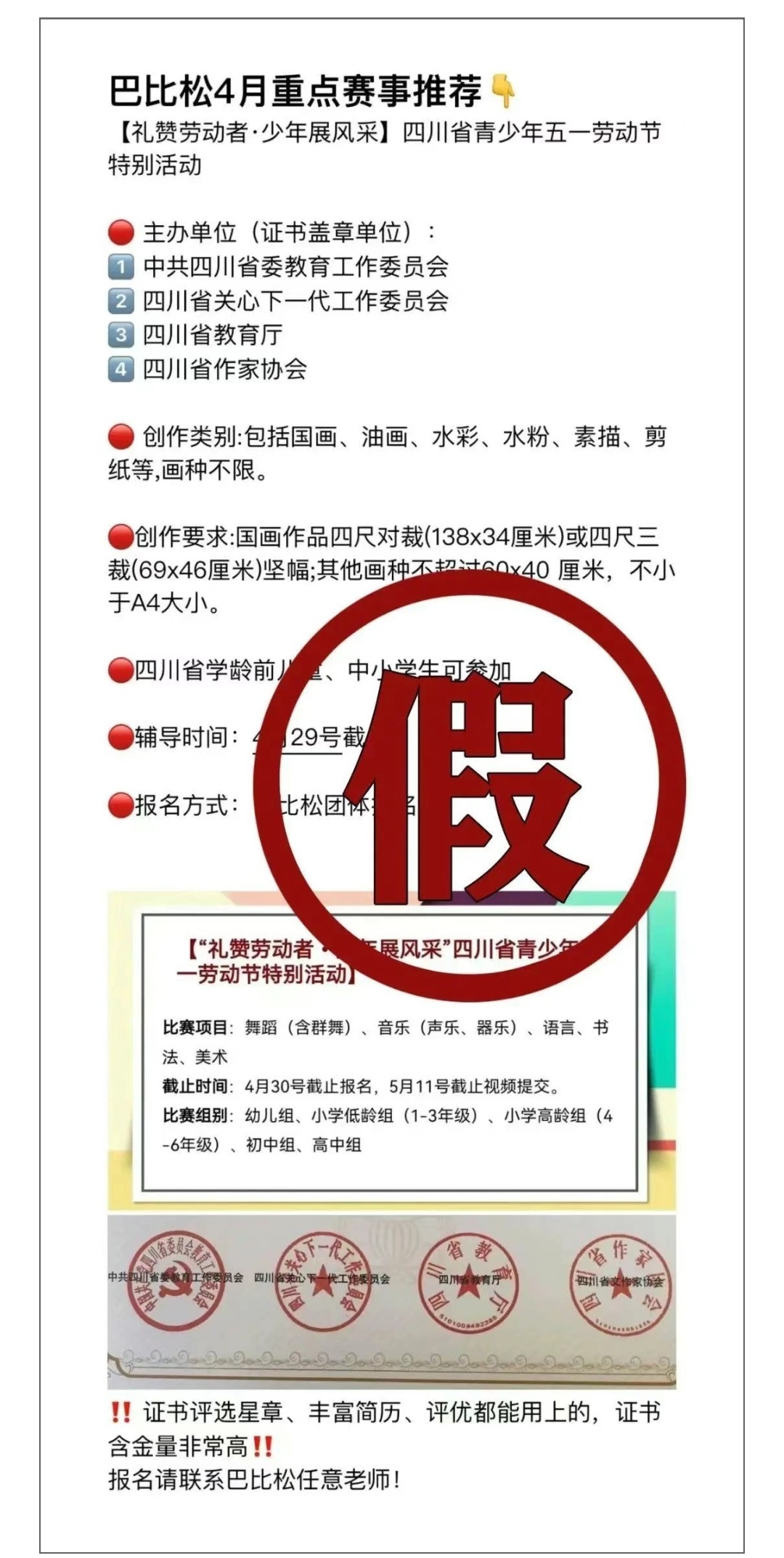 近日,四川省教育廳接群眾舉報,四川巴比松教育咨詢有限公司冒用“中共四川省委教育工作委員會、四川省教育廳”名義違規(guī)組織競賽,偽造公章,向家長進行虛假宣傳,并收取報名費、集訓費。