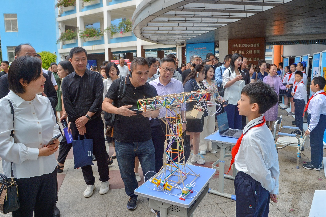 研討活動(dòng)開(kāi)始前,與會(huì)者一起到南寧市濱湖路小學(xué)現(xiàn)場(chǎng)觀摩了科創(chuàng)教育成果。沙漠移動(dòng)水廠、嬰兒自動(dòng)哄睡床等“奇思妙想”,“我和紙的故事”紅豆挑戰(zhàn)賽,“雞蛋撞地球”比輕、拋石機(jī)攻城等科技運(yùn)動(dòng)會(huì)比賽項(xiàng)目展示,以及“AI人工智能對(duì)人類的發(fā)展利大于弊還是弊大于利”校園辯論……孩子們自信大方、敢于創(chuàng)新的表現(xiàn)贏得了大家的紛紛點(diǎn)贊。