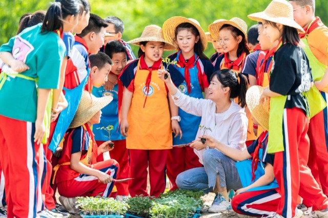 老師在“校園農(nóng)場”內(nèi)向?qū)W生傳授栽種西紅柿秧苗的注意事項(xiàng)。通訊員 丁根厚 攝