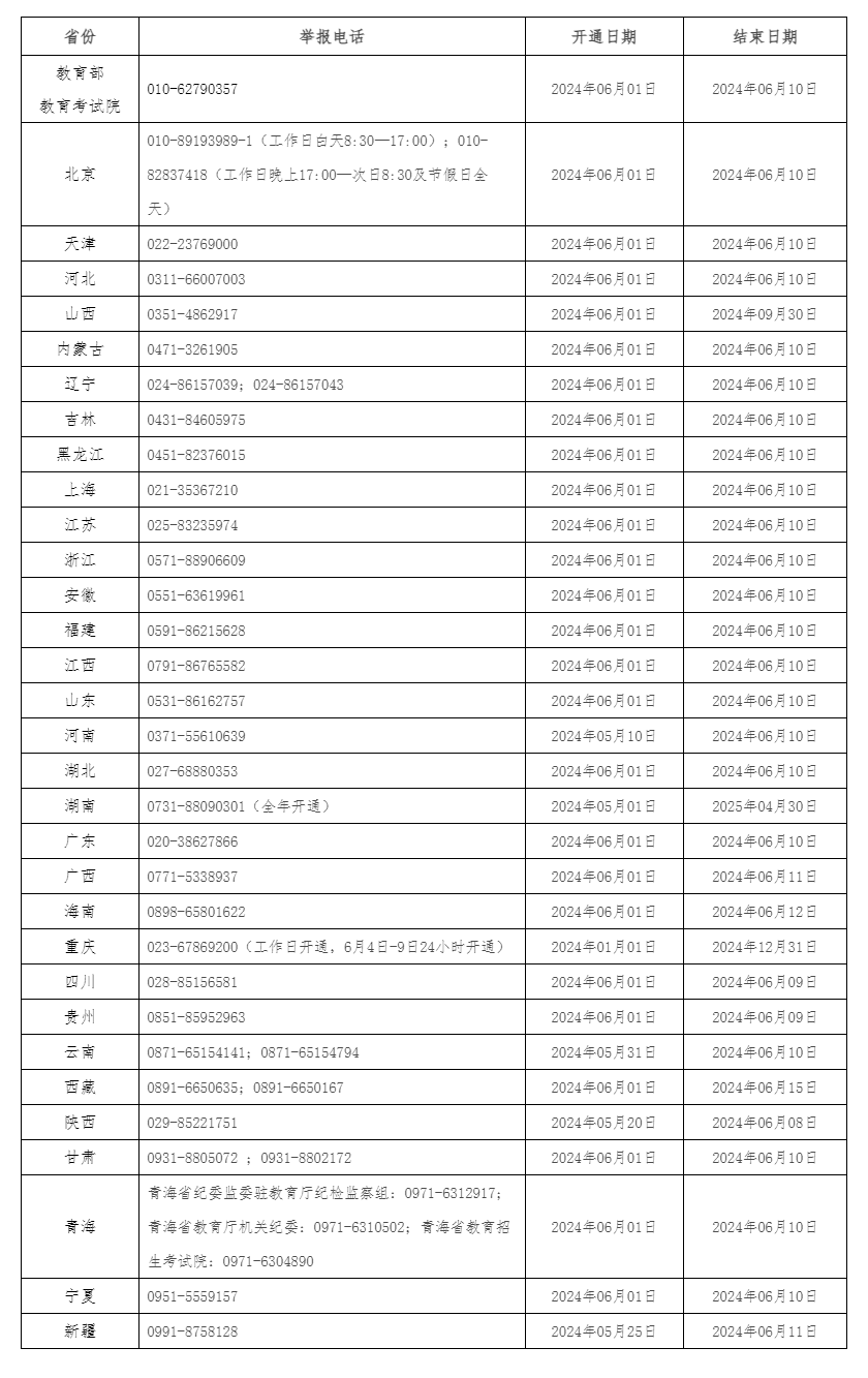 近日,教育部統(tǒng)一公布了教育部以及各?。▍^(qū)、市)2024年的高考舉報(bào)電話(huà),歡迎廣大考生、家長(zhǎng)及社會(huì)各界人士及時(shí)舉報(bào)反映涉及2024年高考的問(wèn)題線(xiàn)索。教育部及各?。▍^(qū)、市)將會(huì)同有關(guān)部門(mén)根據(jù)舉報(bào)線(xiàn)索第一時(shí)間核查處理,堅(jiān)決維護(hù)高考公平公正。