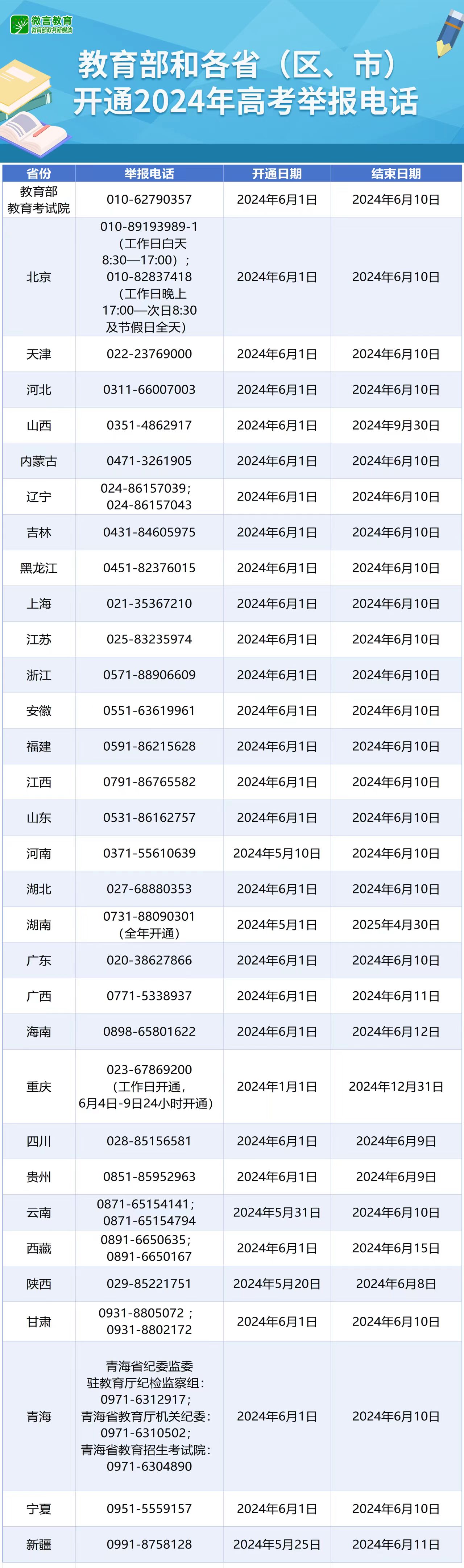 中國(guó)教育報(bào)-中國(guó)教育新聞網(wǎng)訊(記者 歐媚)記者從教育部官網(wǎng)獲悉,近日,教育部統(tǒng)一公布了教育部以及各省(區(qū)、市)2024年的高考舉報(bào)電話,歡迎廣大考生、家長(zhǎng)及社會(huì)各界人士及時(shí)舉報(bào)反映涉及2024年高考的問(wèn)題線索。教育部及各?。▍^(qū)、市)將會(huì)同有關(guān)部門(mén)根據(jù)舉報(bào)線索第一時(shí)間核查處理,堅(jiān)決維護(hù)高考公平公正。