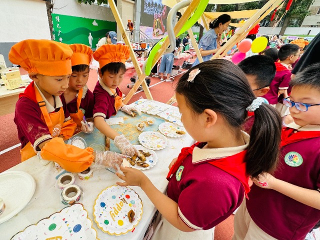 展位旁,孩子們擔任講解員,聲音響亮地介紹自己的勞動創(chuàng)意作品。“美食大排檔”上,皮薄餡多的餃子、軟糯香甜的粽子、香醇可口的蛋撻,散發(fā)著誘人的香氣?!靶N師”熱情為同學送上美味的食物,有的還在現(xiàn)場制作,忙得不亦樂乎。