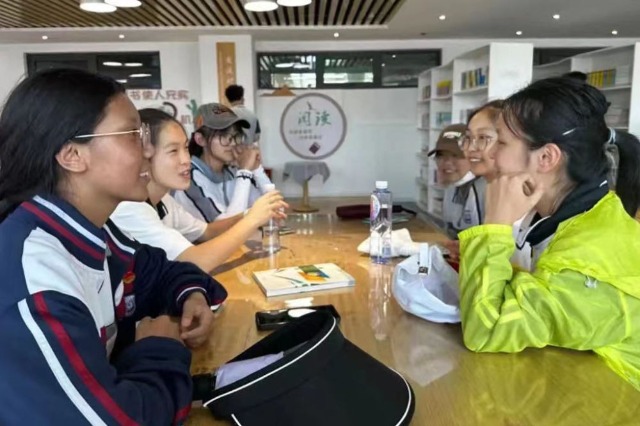2023年7月10日,在果洛西寧民族中學(xué),上海市大同中學(xué)學(xué)生(右)與果洛西寧民族中學(xué)學(xué)生交流。新華社發(fā)(果洛州教育局供圖)