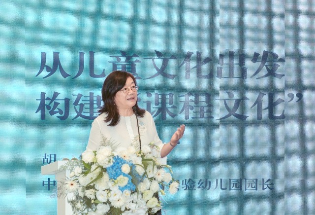 中華女子學(xué)院附屬實(shí)驗(yàn)幼兒園園長胡華作主旨報(bào)告,引導(dǎo)與會教師思考如何從兒童出發(fā),構(gòu)建“課程文化的時(shí)間與空間”。她指出,兒童的日常生活是兒童文化生成的田野,也是兒童文化研究的起點(diǎn),幼兒園教師要以“螞蟻之眼”看世界,用情感打開通向兒童文化的大門。生活化課程就是尋找兒童文化與社會文化的平衡,構(gòu)建一個(gè)表達(dá)兒童自我的空間,在日積月累中形成一定的課程文化。