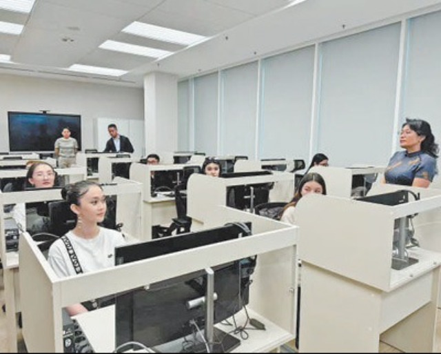 近日,阿斯塔納國際大學學生在北京語言大學哈薩克斯坦分校的教室里體驗通過國際中文智慧教學系統(tǒng)學習中文。邢曉婧 攝