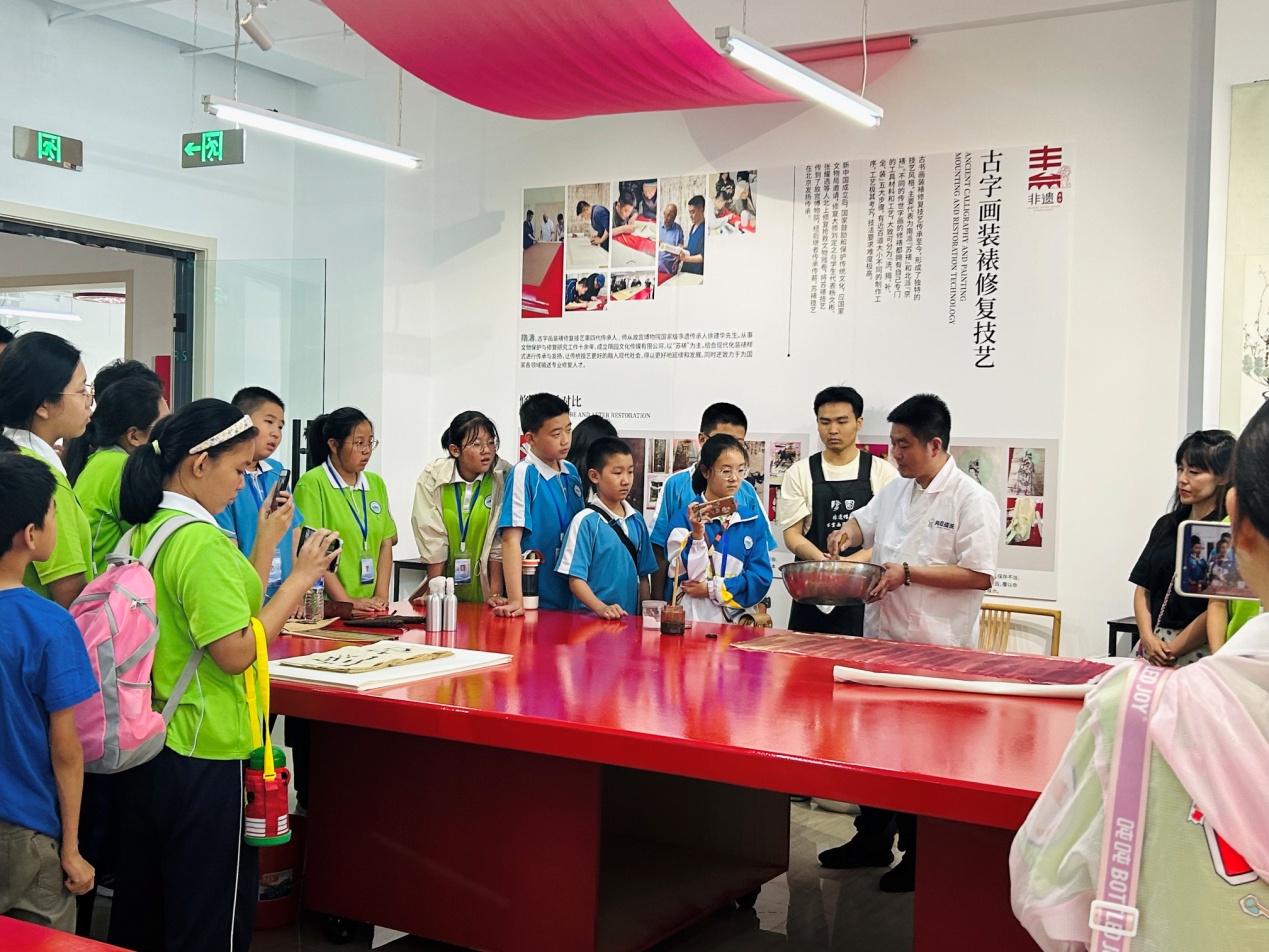 古字畫裝裱修復(fù)技藝傳承人隋濤在非遺體驗(yàn)中心就有一處自己的工作室,他告訴記者,隨著傳統(tǒng)文化的復(fù)興,非遺技藝越發(fā)受到重視,從曾經(jīng)某一行當(dāng)?shù)男”娂妓囎兂闪撕⒆觽兞私庵腥A傳統(tǒng)文化的“叩門磚”。“這些年,我們不斷收到一些學(xué)校的邀約,帶著非遺進(jìn)校園,現(xiàn)在很多孩子都學(xué)寫毛筆字,跟他們講書畫的裝裱修復(fù),他們都非常感興趣?!?/span>