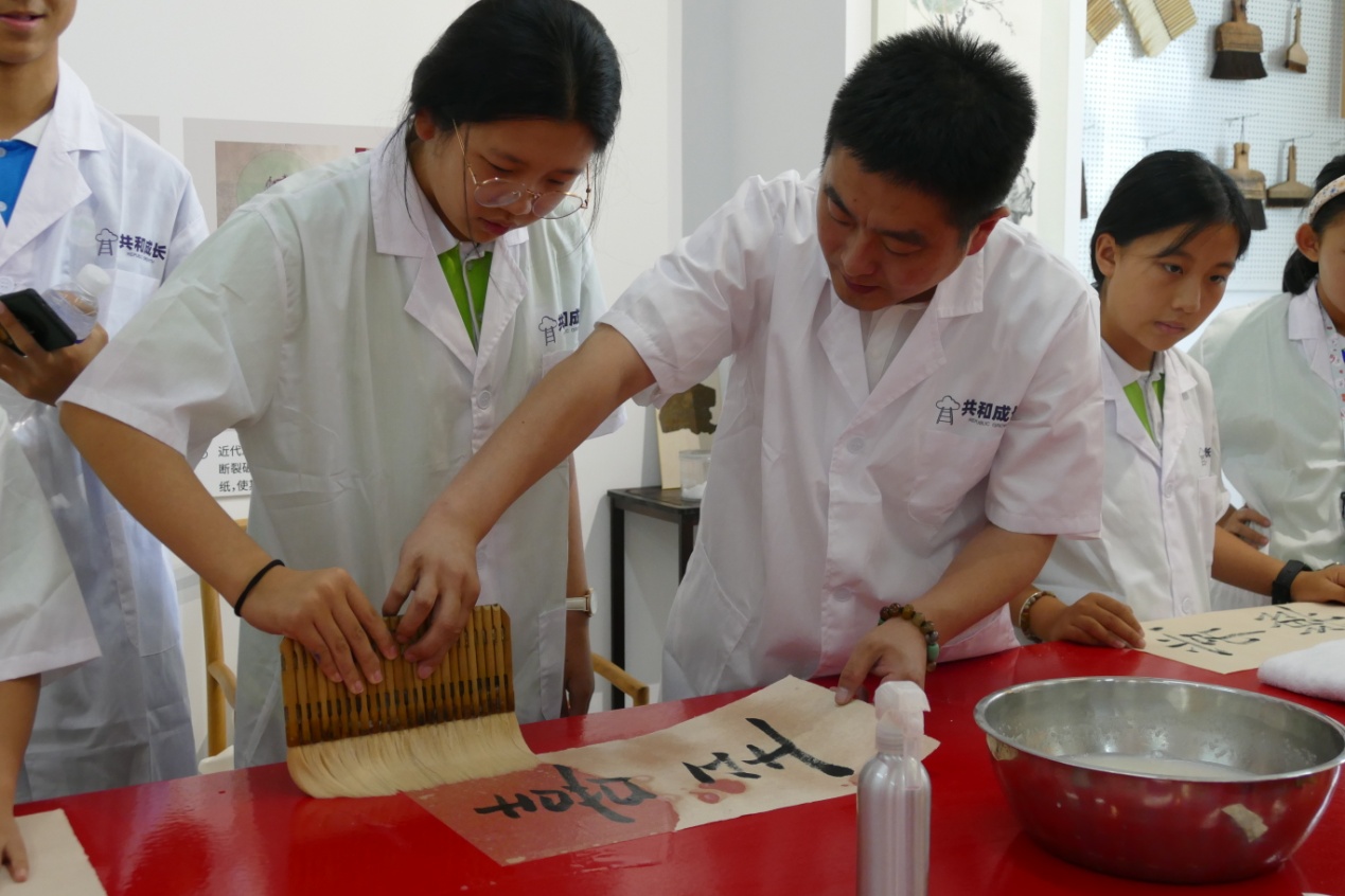 學(xué)生們學(xué)習(xí)用排刷、糨子裝裱作品。