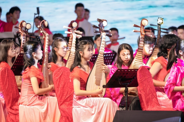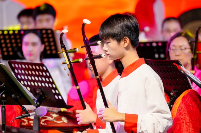 當(dāng)天,來(lái)自寧波市鄞州中學(xué)藍(lán)青民樂(lè)團(tuán)、寧波市效實(shí)中學(xué)民樂(lè)團(tuán)、臺(tái)中市豐原青少年民樂(lè)團(tuán)的百余名青少年同臺(tái)演出,共同開(kāi)啟探尋中華文化之旅。