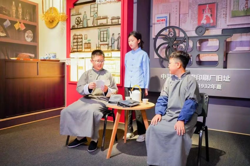 此外,學(xué)生們還結(jié)合展覽內(nèi)容與展陳空間,排練了短劇《真理的味道是甜的》《1925年5月30日》與《秘密印刷廠》,以情景短劇的形式呈現(xiàn)歷史,將展廳化為歷史現(xiàn)場(chǎng),讓學(xué)習(xí)變得更為生動(dòng)、立體、深入。