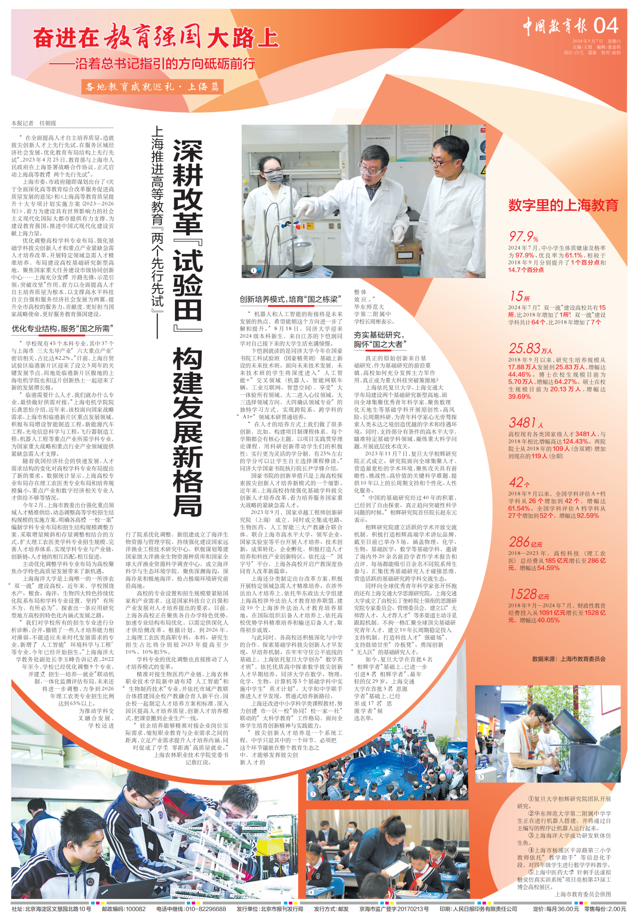 優(yōu)化調(diào)整高校學(xué)科專業(yè)布局,強(qiáng)化基礎(chǔ)學(xué)科拔尖創(chuàng)新人才和重點(diǎn)產(chǎn)業(yè)緊缺急需人才培養(yǎng)改革,開展特定領(lǐng)域急需人才精準(zhǔn)培養(yǎng),布局建設(shè)高?;A(chǔ)研究新型高地,聚焦國家重大任務(wù)建設(shè)市級協(xié)同創(chuàng)新中心……上海充分發(fā)揮“開路先鋒、示范引領(lǐng)、突破攻堅”作用,著力以全面提高人才自主培養(yǎng)質(zhì)量為根本,以支撐高水平科技自立自強(qiáng)和服務(wù)經(jīng)濟(jì)社會發(fā)展為兩翼,提升全市高校的服務(wù)力、貢獻(xiàn)度,更好擔(dān)當(dāng)國家戰(zhàn)略使命,更好服務(wù)教育強(qiáng)國建設(shè)。