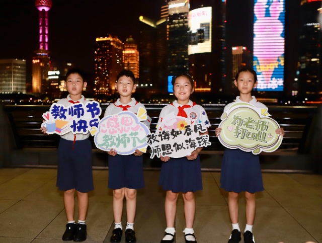 中國教育報(bào)-中國教育新聞網(wǎng)訊(記者 任朝霞)9月9日晚,在第40個教師節(jié)來臨之際,位于上海黃浦江兩岸的震旦大廈、花旗大廈、白玉蘭廣場、國際港務(wù)大廈、上海中心等地標(biāo)性高樓大屏滾動播放“大力弘揚(yáng)教育家精神,加快建設(shè)教育強(qiáng)國”“弘揚(yáng)教育家精神 強(qiáng)國筑夢新時(shí)代”“老師,您好!”“教師節(jié)快樂!”“老師,您辛苦了!”等標(biāo)語,共同向廣大教師致敬,營造尊師重教的濃厚氛圍。