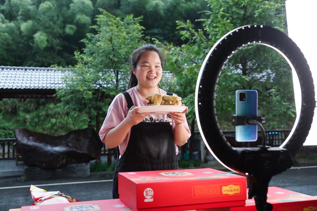 2024年9月19日,浙江省諸暨市嶺北鎮(zhèn)一位主播在直播銷(xiāo)售嶺北鹽焗雞。新華社記者徐昱攝