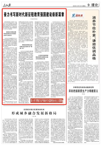 教育是強(qiáng)國(guó)建設(shè)、民族復(fù)興之基。習(xí)近平總書(shū)記在全國(guó)教育大會(huì)上的重要講話,對(duì)新時(shí)代新征程加快建設(shè)教育強(qiáng)國(guó)作出系統(tǒng)部署,向全黨全社會(huì)發(fā)出建設(shè)教育強(qiáng)國(guó)的動(dòng)員令。教育系統(tǒng)將堅(jiān)定不移抓好落實(shí),勇?lián)d教強(qiáng)教新使命,不斷開(kāi)創(chuàng)工作新局面。