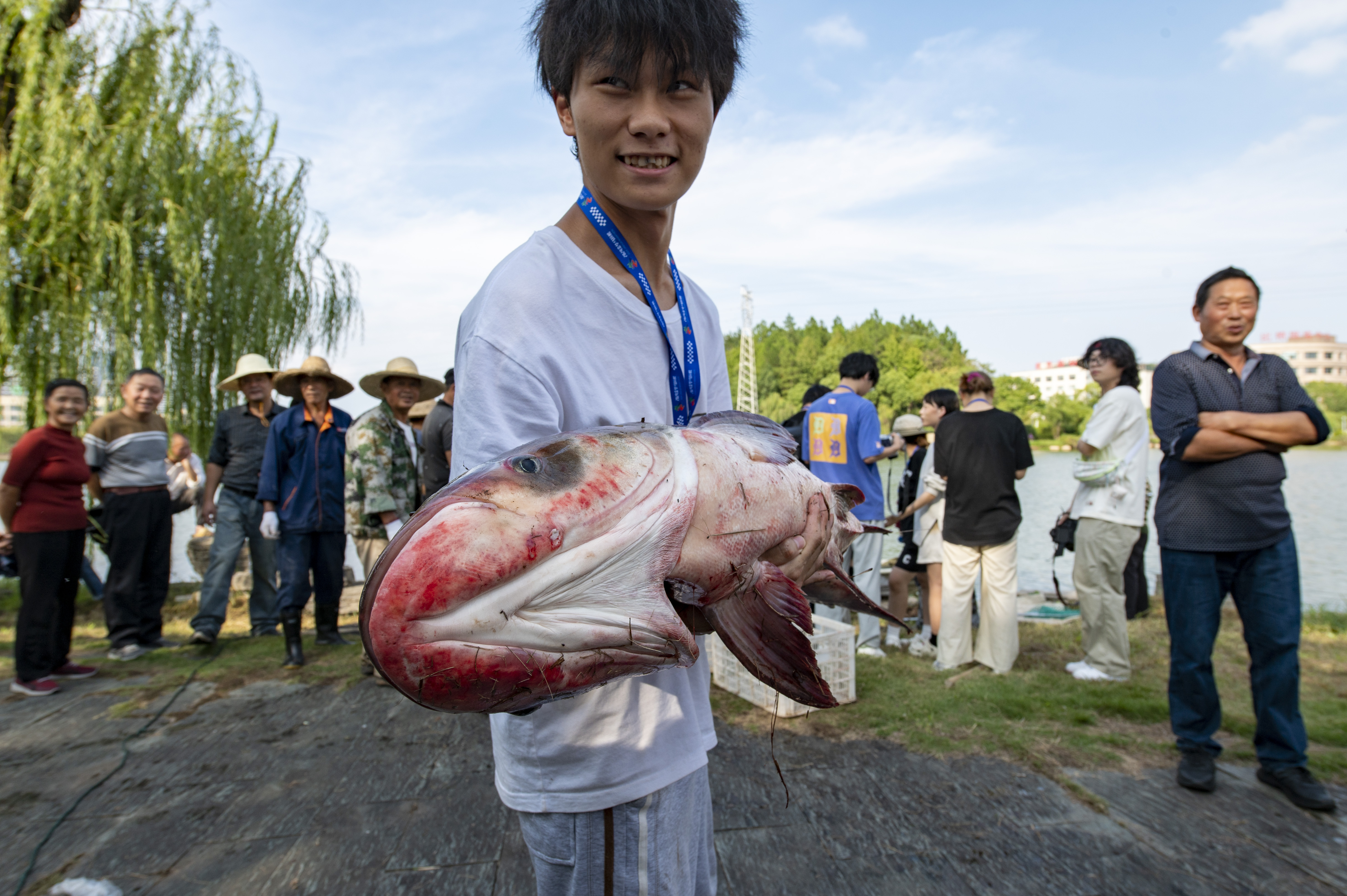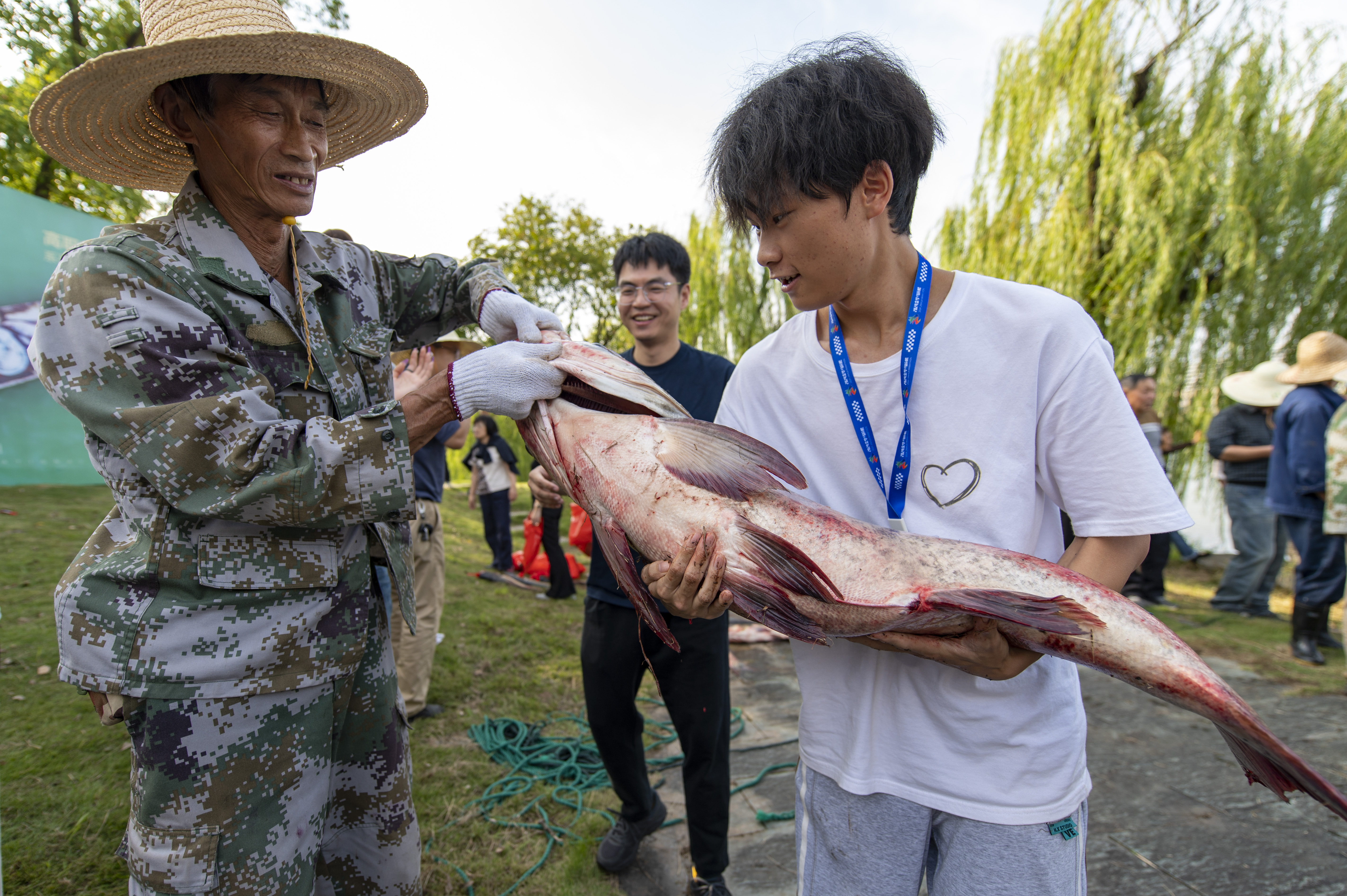 大學(xué)生抱著剛剛捕獲的大魚,體驗捕魚節(jié)的喜悅。通訊員 胡肖飛 攝