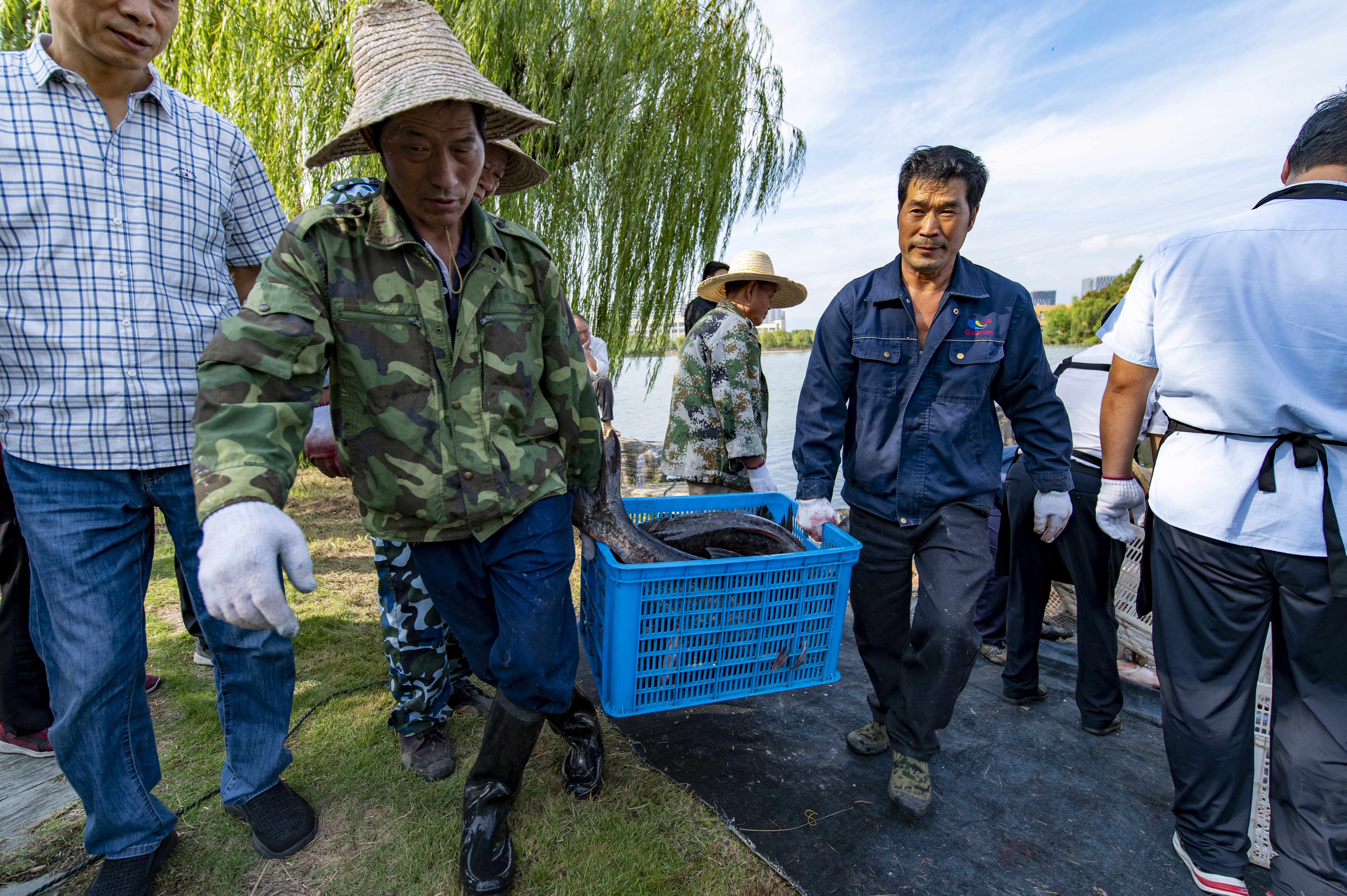 工作人員把魚裝箱抬上岸。通訊員 胡肖飛 攝