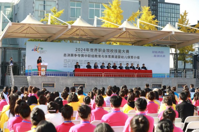 2024年世界職業(yè)院校技能大賽總決賽爭奪賽中職組教育與體育賽道嬰幼兒保育小組開賽。圖為10月28日開賽式。北京市求實職業(yè)學(xué)校供圖
