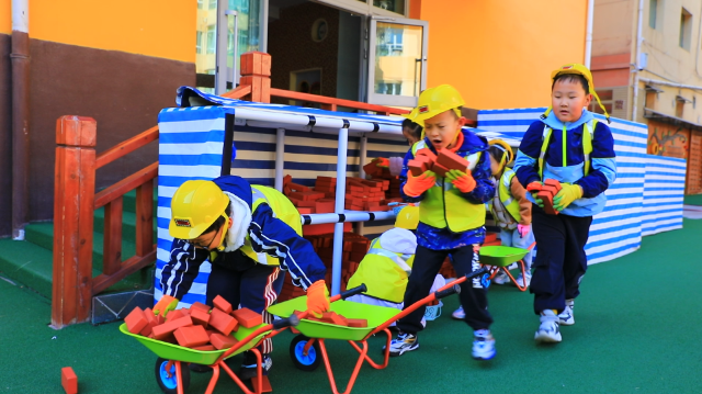 中國教育報-中國教育新聞網(wǎng)訊(通訊員 林冰瑩 記者 余闖)“我想給我們家小貓蓋一個房子”“我想搭一座大城堡”“我想建一座高塔”……近日一節(jié)活動課上,青海省西寧市第一幼兒園的小朋友們身穿防護(hù)服、頭戴安全帽、手戴安全手套,有的捧著小方磚,有的推著小貨車,還有的拿著工具尺,快樂地沉浸在游戲中。