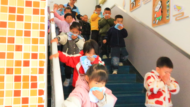 幼兒園開展疏散逃生演習(xí)。楊青 攝