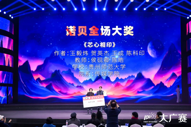 全場大獎是大廣賽最高獎項,經(jīng)過全國總評審的評委投票、評議,從10個作品類別中評選出4組備選作品?,F(xiàn)場通過作品展示、闡述要點、評委點評、現(xiàn)場投票等環(huán)節(jié),最后由大廣賽資深評委投票決出全場大獎得主。經(jīng)過現(xiàn)場激烈角逐和尖峰對決,貴州師范大學(xué)傳媒學(xué)院的王毅煒、賀英杰、王成、陳科印同學(xué)以作品科大訊飛命題微電影作品《芯心相印》的超凡創(chuàng)意與優(yōu)秀舞臺表現(xiàn)力,贏得評委和現(xiàn)場觀眾的一致好評,最終獲得第16屆大廣賽全場大獎。