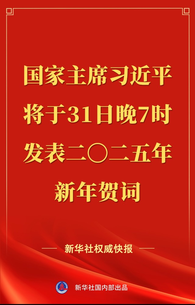 新華社北京12月30日電 國家主席習(xí)近平將于31日晚7時(shí)通過中央廣播電視總臺(tái)和互聯(lián)網(wǎng),發(fā)表二〇二五年新年賀詞。中央廣播電視總臺(tái)所屬中央電視臺(tái)綜合頻道、新聞?lì)l道、中文國際頻道、4K頻道,中國國際電視臺(tái)各外語頻道,中央人民廣播電臺(tái),中國國際廣播電臺(tái),以及人民網(wǎng)、新華網(wǎng)、央視新聞客戶端等中央主要新聞媒體所屬網(wǎng)站、新媒體平臺(tái)將準(zhǔn)時(shí)播出。
