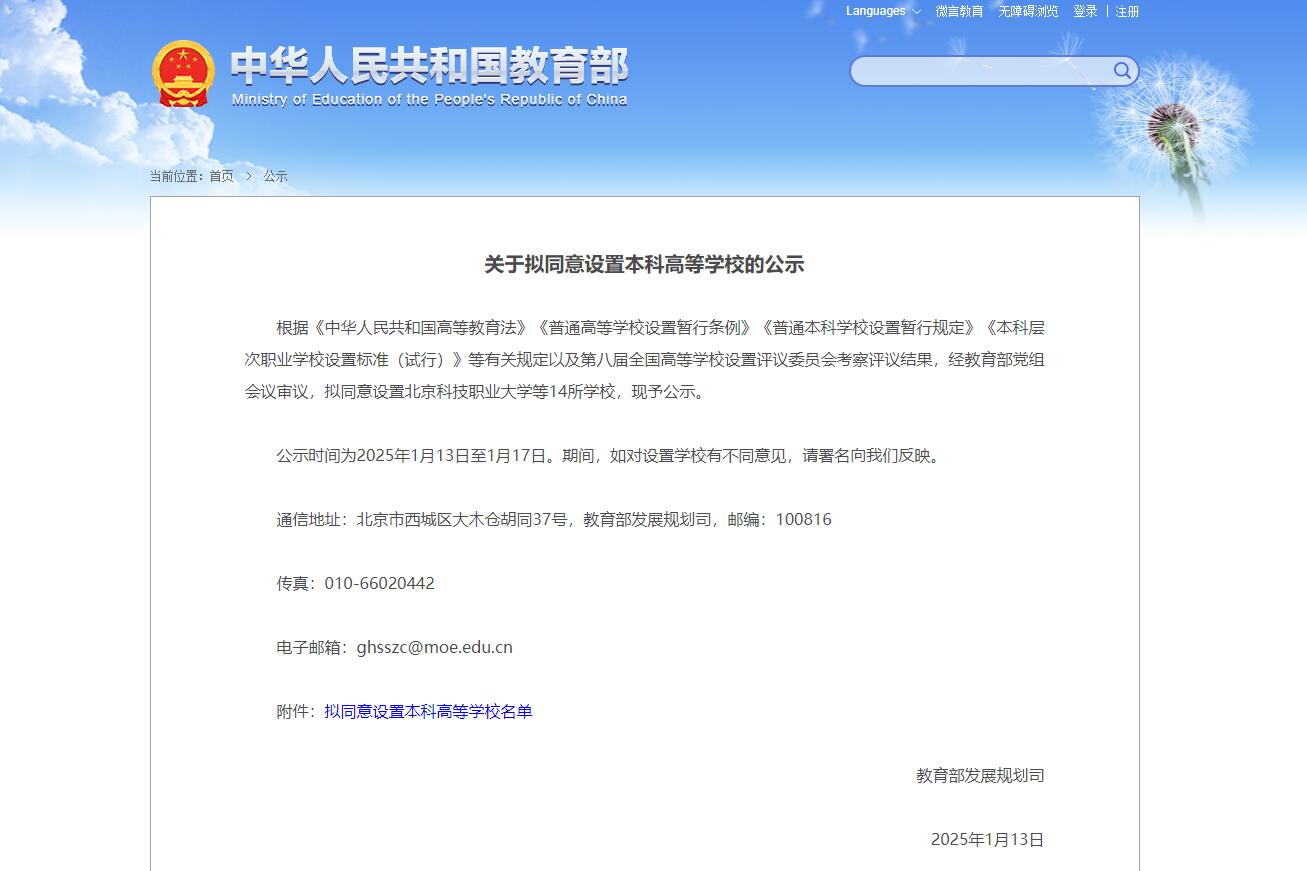 今天(1月13日),教育部發(fā)布關(guān)于擬同意設(shè)置本科高等學(xué)校的公示。