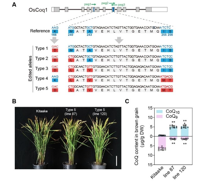 結(jié)合對1000多種陸生植物輔酶Q側(cè)鏈合成酶Coq1氨基酸序列的進化分析和機器學(xué)習(xí),科研團隊最終確定了決定鏈長的5個氨基酸位點。再通過精準(zhǔn)的基因編輯,創(chuàng)制了主要合成輔酶Q10的水稻。實際種植表明,水稻的生長和產(chǎn)量均未受影響。