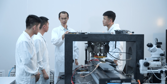 圖為劉小康(右二)在實驗室指導(dǎo)學(xué)生做實驗。(重慶理工大學(xué)供圖)