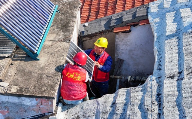 2025年3月2日,浙江余姚大城小愛公益服務(wù)中心志愿者在一老舊小區(qū)開展太陽能照明公益改造,照亮老社區(qū)居民的回家路(無人機(jī)照片)。