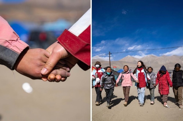 在西藏日喀則市定日縣長所鄉(xiāng)森嘎村,西部計(jì)劃志愿者周漣笛和地震災(zāi)區(qū)孩子們在一起,幫助他們疏導(dǎo)心理(拼版照片,2025年1月13日攝)。新年伊始,一場突如其來的地震打破了高原的寧靜。眾多志愿服務(wù)力量緊急奔赴,為受災(zāi)群眾帶來溫暖和力量。
