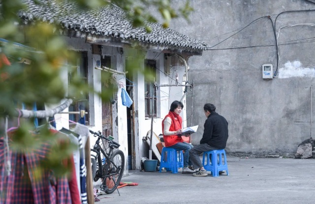2023年9月13日,浙江湖州愛山街道安定書院的社區(qū)志愿者為獨(dú)居老人帶來代買的蔬菜。該志愿團(tuán)隊(duì)由中老年志愿者組成,以銀齡公益互助的形式,為高齡老年人提供公益志愿服務(wù)。