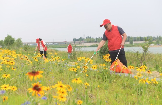 2024年6月5日,環(huán)保志愿者在河北省石家莊新樂市磁河木刀溝生態(tài)濕地?fù)焓袄?/strong>