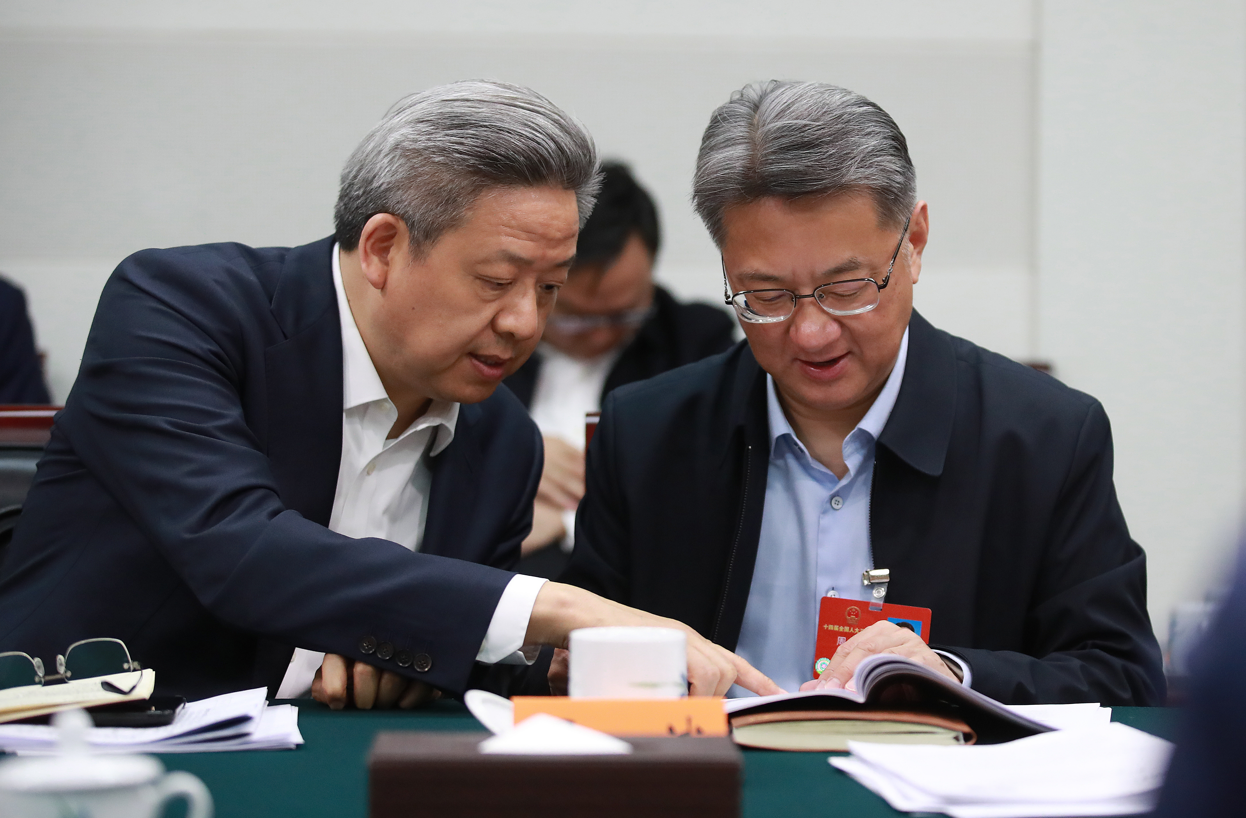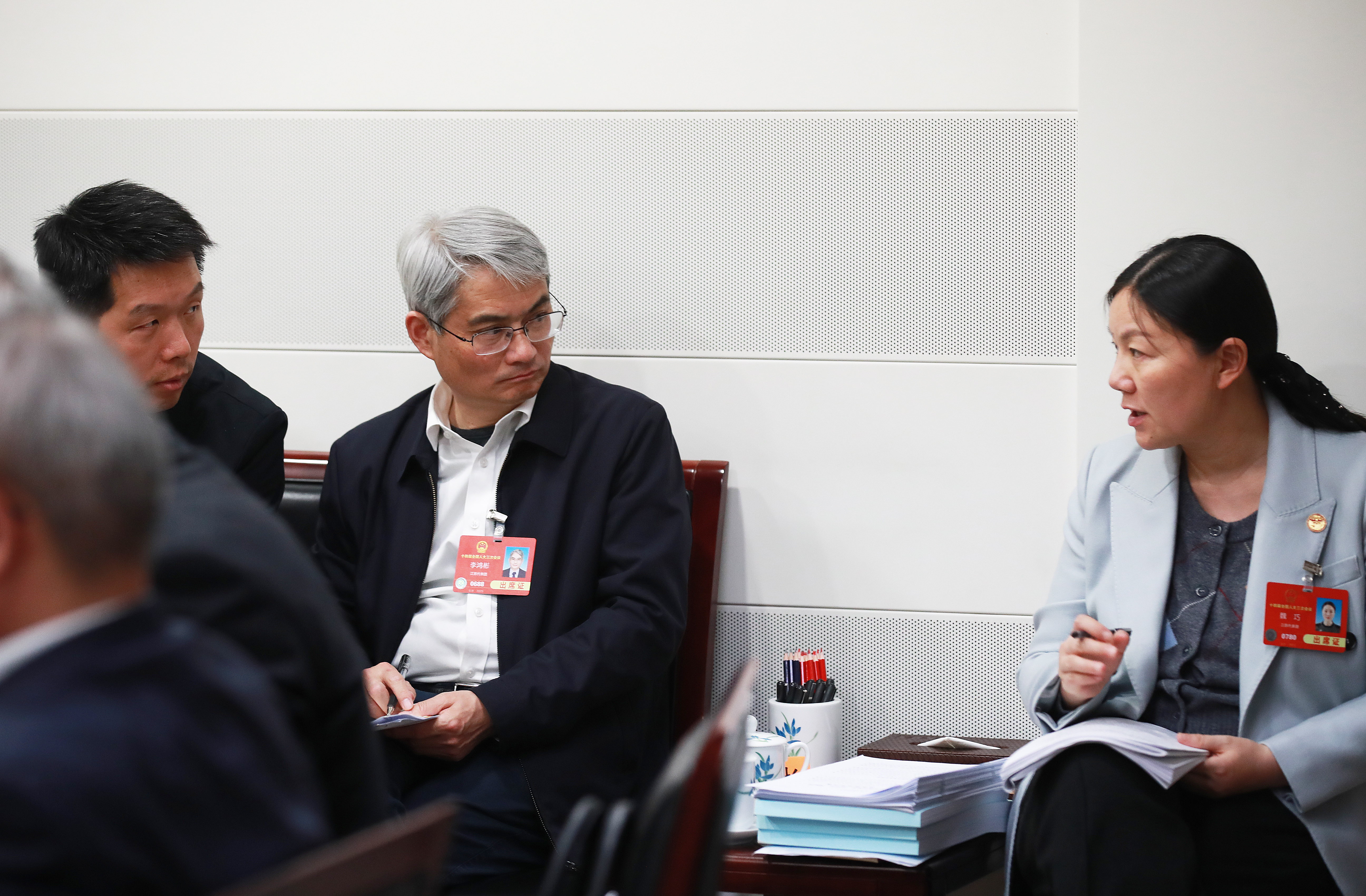 3月6日,十四屆全國人大三次會議小組會議期間,全國人大代表、江蘇省南京外國語學校副校長李鴻彬與其他代表交流。今年,李鴻彬建議加強新時代科學文化建設(shè),培植有中國特色的科學文化。 本報記者 張學軍 攝