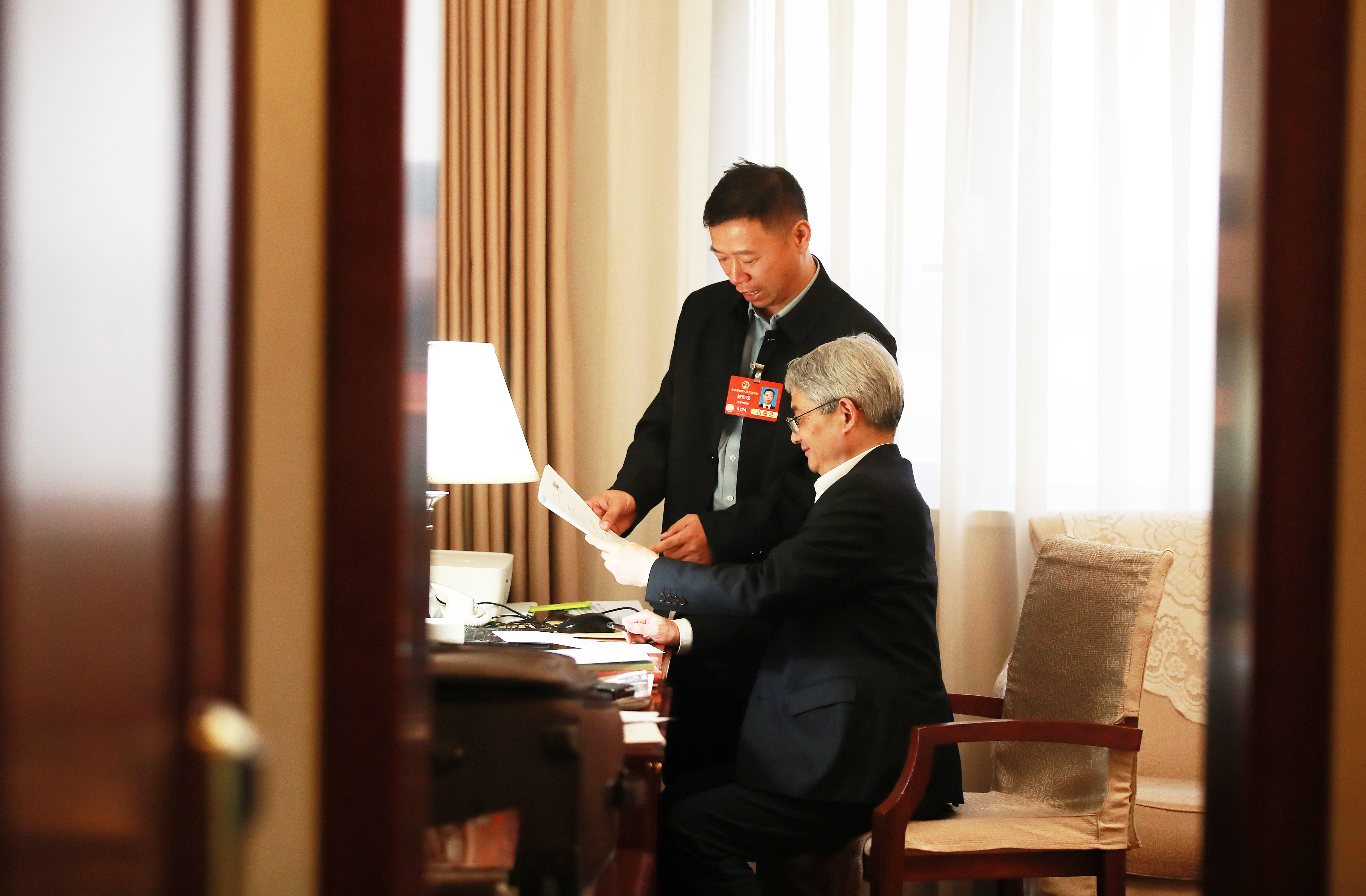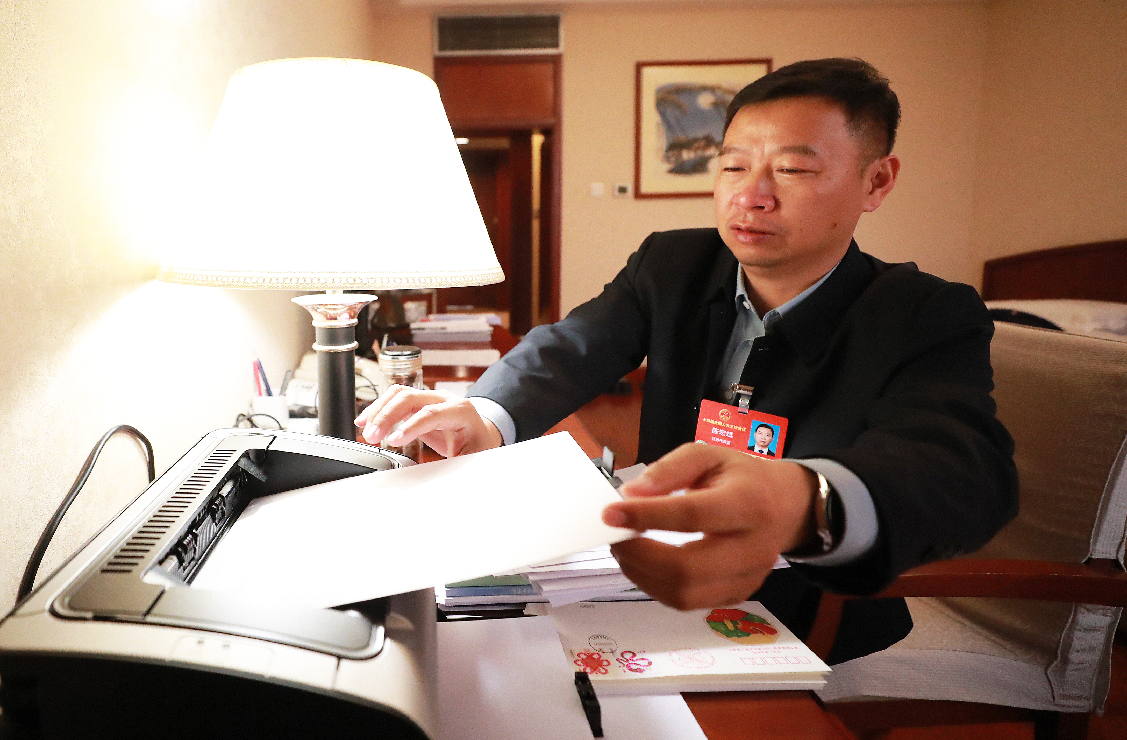 3月6日,陳宏斌在駐地打印會議資料。電腦是他隨身攜帶的。