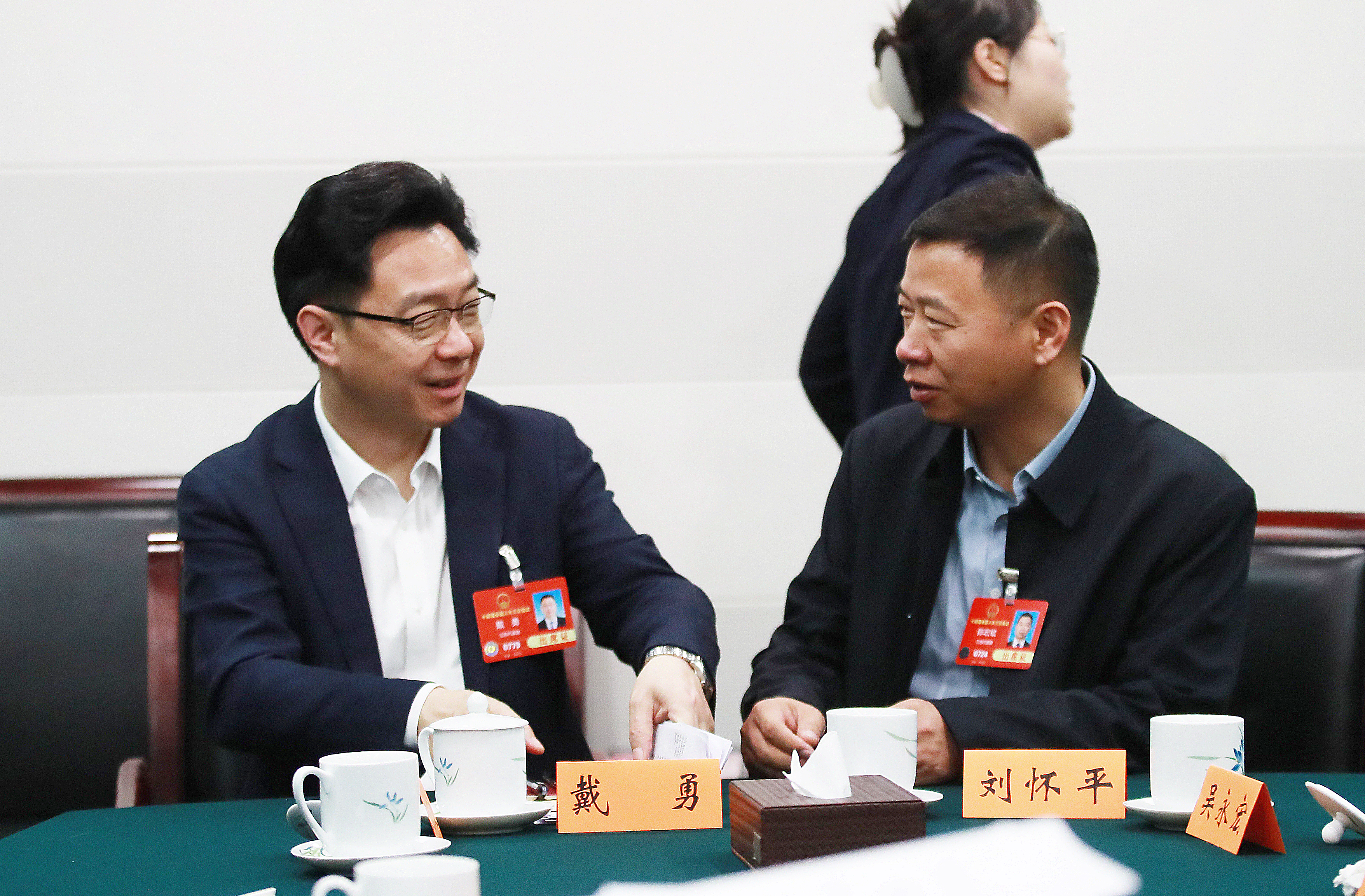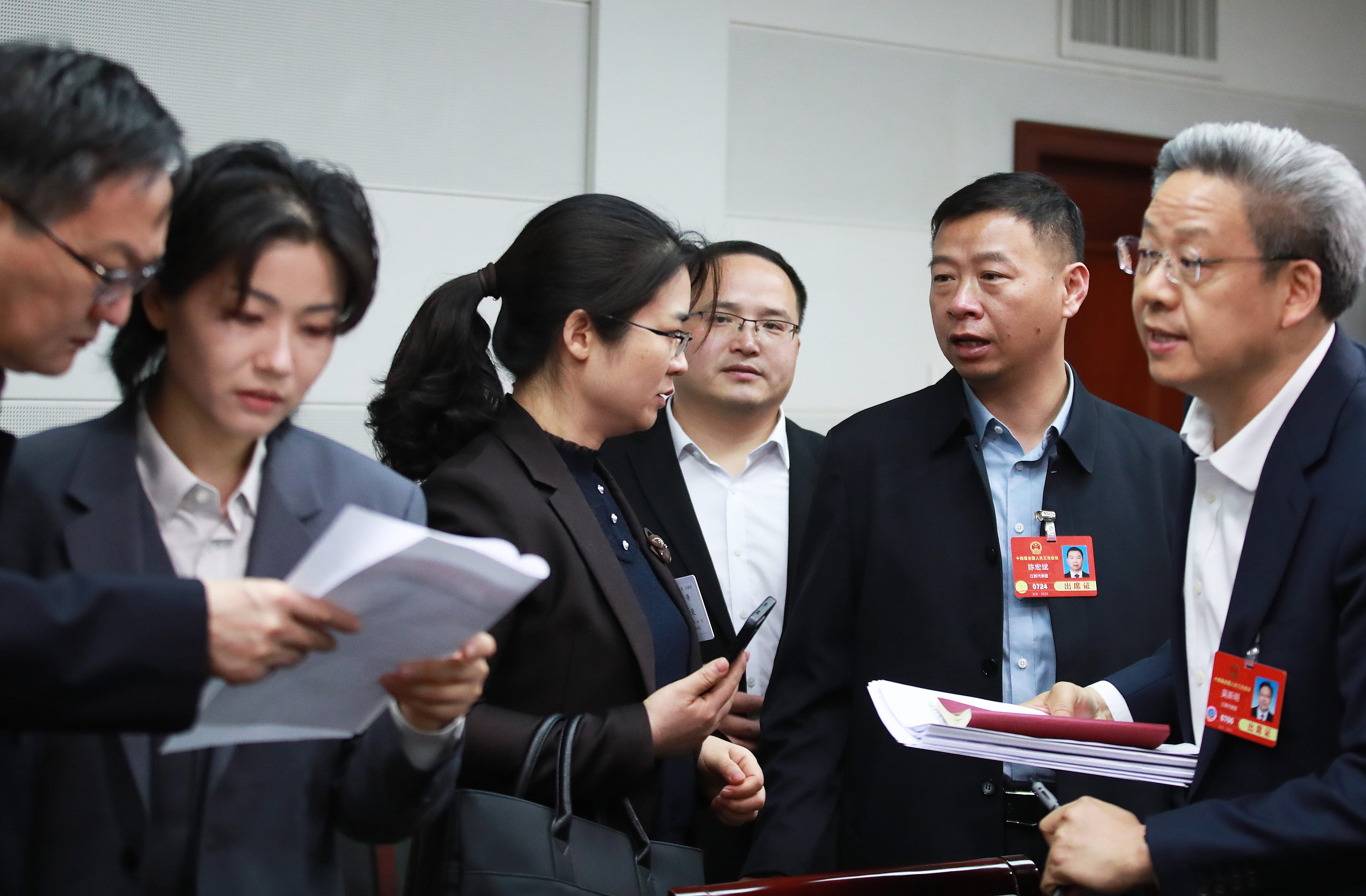 3月6日,小組會議間隙,陳宏斌與其他代表交流。