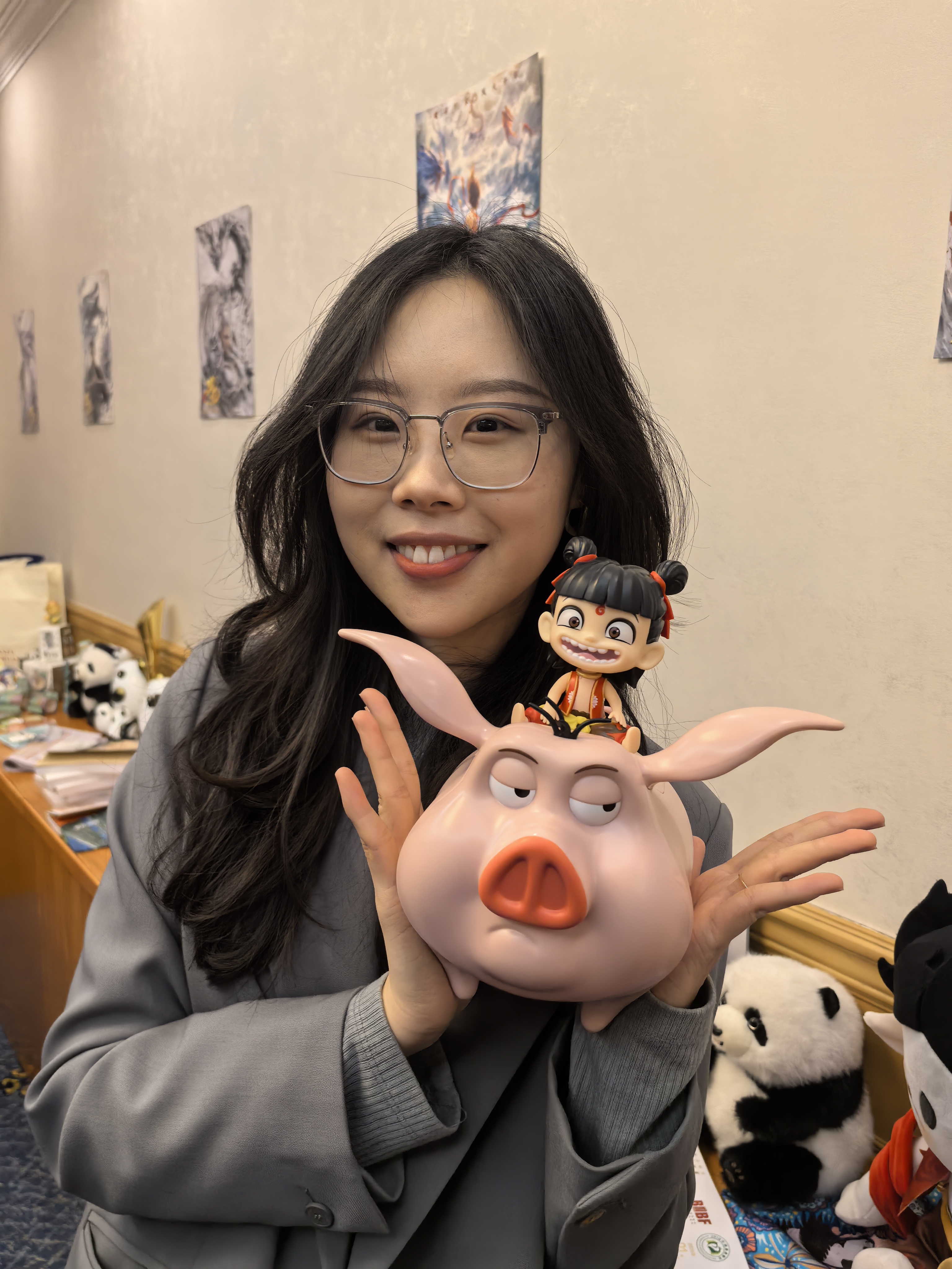 3月7日,十四屆全國(guó)人大三次會(huì)議四川代表團(tuán)舉行開(kāi)放團(tuán)組會(huì)議,現(xiàn)場(chǎng)布置了《哪吒》展區(qū)。記者在哪吒周邊產(chǎn)品拍照留念。(記者供圖)