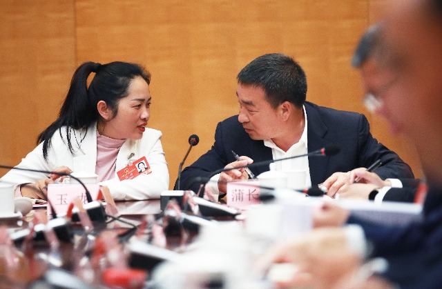 3月9日,代表小組會議期間,全國人大代表、云南省勐??h第一小學(xué)教師玉龍(左)和蒲長文代表交流。