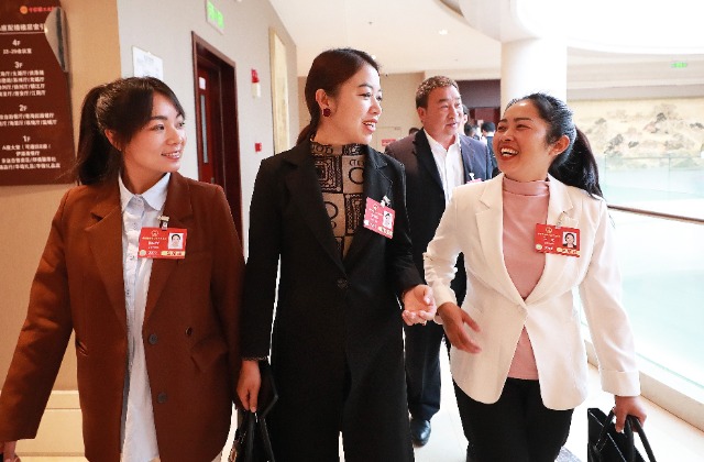 3月9日,上午的小組會議結(jié)束后,玉龍(右)和代表們邊走邊交流。
