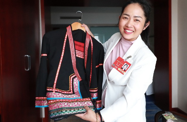 3月9日,玉龍向記者展示代表著春天顏色的布朗族傳統(tǒng)服飾?!拔蚁M┥厦褡迨⒀b參加兩會,展示布朗族的文化魅力,也讓更多人關(guān)注少數(shù)民族文化的傳承和發(fā)展?!庇颀堈f。