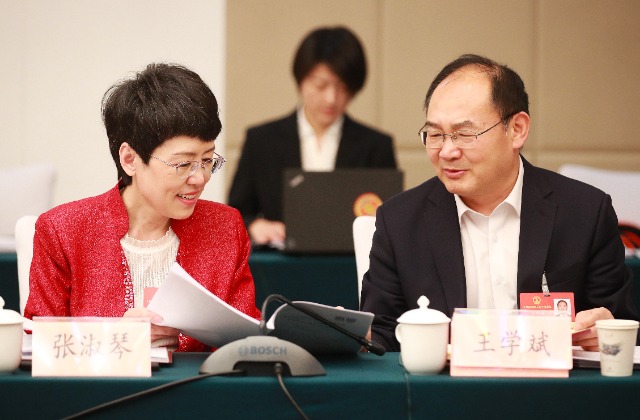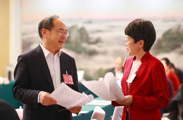 3月10日,十四屆全國(guó)人大三次會(huì)議山東代表團(tuán)小組會(huì)議,全國(guó)人大代表、臨沂市北城小學(xué)黨總支書記張淑琴(左)與全國(guó)人大代表、臨沂大學(xué)食品研究院院長(zhǎng)王學(xué)斌交流。